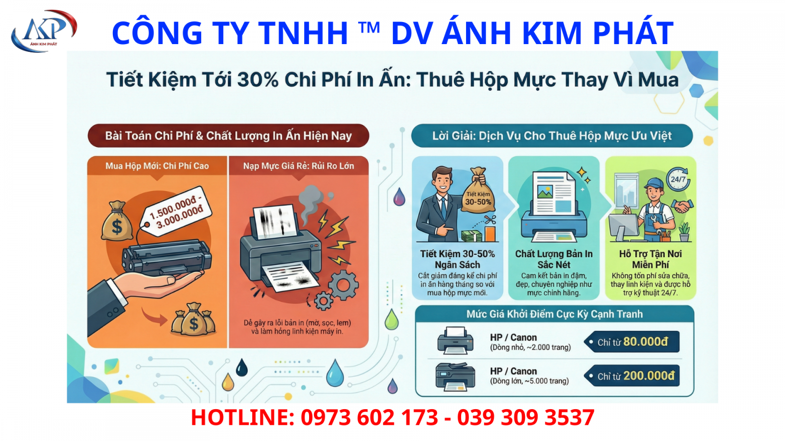 Bạn đang đau đầu vì chi phí mua hộp mực in chính hãng quá cao? Hay bạn cảm thấy phiền toái vì bản in bị mờ, lem luốc mỗi khi nạp mực ngoài? Tại CTY ÁNH KIM PHÁT, chúng tôi mang đến giải pháp cho thuê hộp mực máy in doanh nghiệp giá rẻ tại Hồ Chí Minh. Đây là dịch vụ giúp doanh nghiệp tiết kiệm đến 60% chi phí in ấn, cam kết bản in sắc nét và hỗ trợ kỹ thuật tận nơi 24/7.