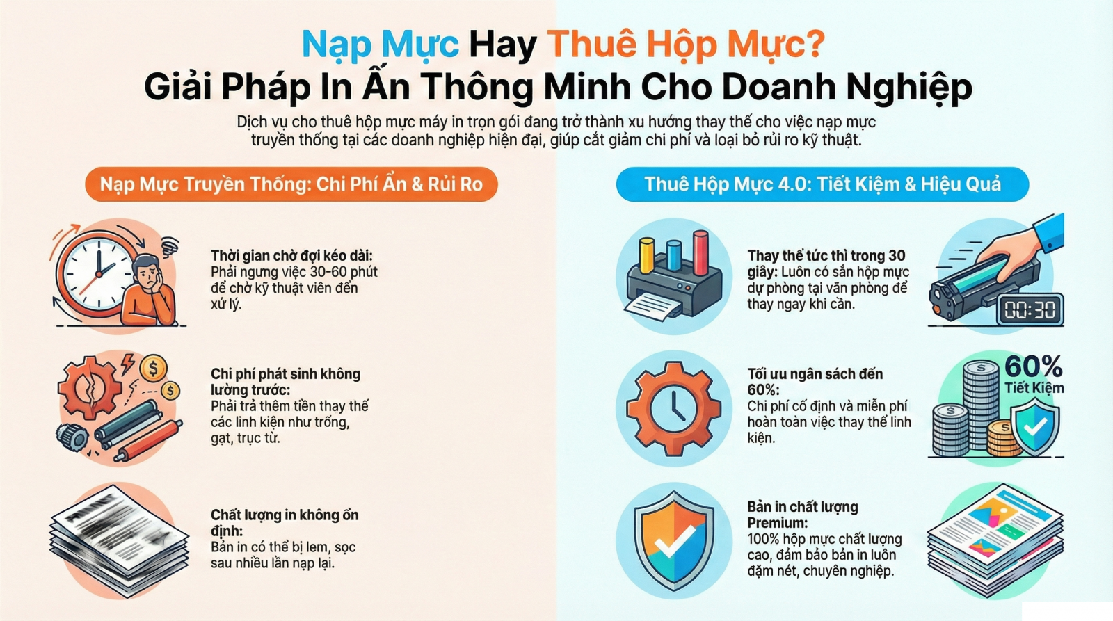 Thay vì tiêu tốn ngân sách vào việc mua mới hay loay hoay với dịch vụ nạp mực truyền thống vốn nhiều rủi ro, thuê hộp mực máy in đang trở thành xu hướng tối ưu cho các doanh nghiệp hiện đại tại TP.HCM. Đây không chỉ là cách để cắt giảm chi phí mà còn là giải pháp quản lý in ấn thông minh, giúp bạn gạt bỏ hoàn toàn nỗi lo về kỹ thuật.